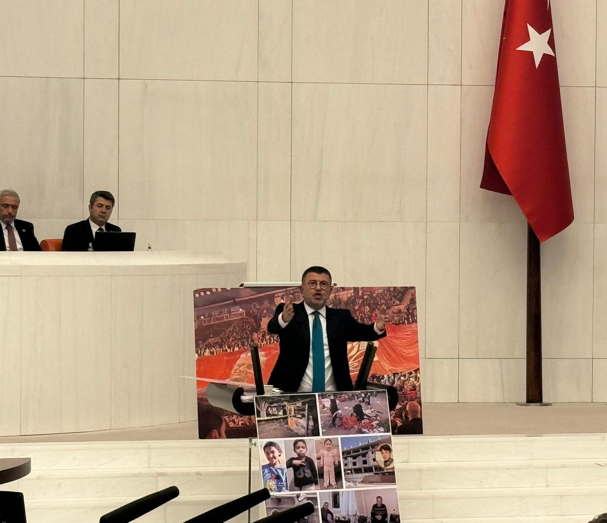 Meclis TV, Ağbaba kürsüde konuşurken pankartın görünmemesi için 4 kez açı değiştirdi.